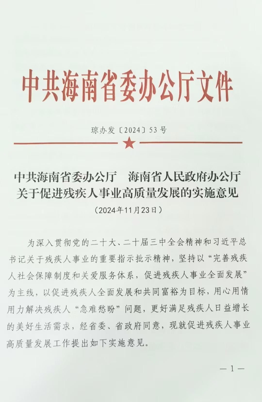 图为中共海南省委办公厅 海南省人民政府办公厅 关于促进残疾人事业高质量发展的实施意见(2024年11月23日)文件