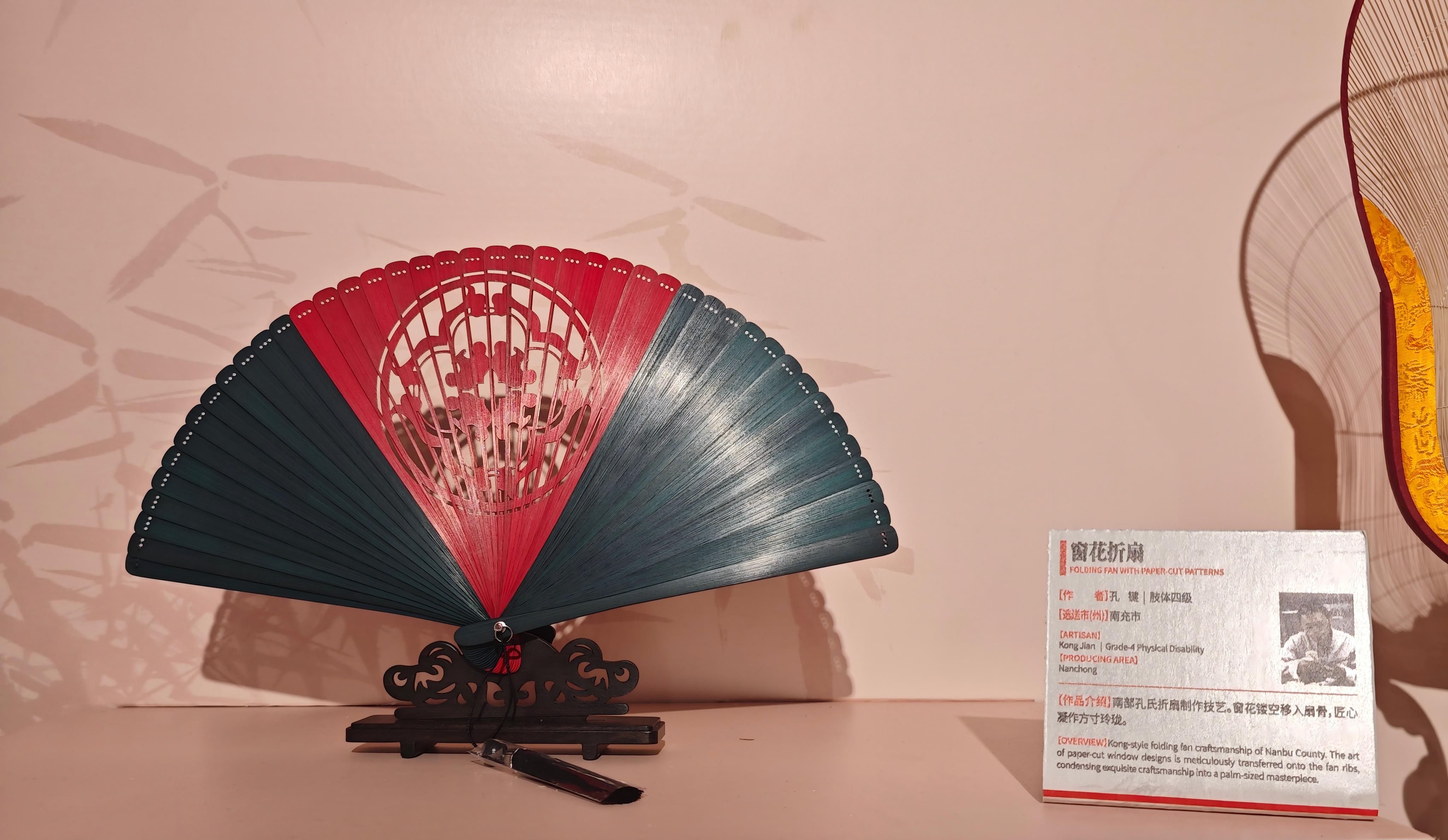 作品简介:《镂空窗花折扇》采用慈竹材料制作,先将材料劈为一片一片的薄片后染色,将小骨位置雕刻上故宫的标准窗花。