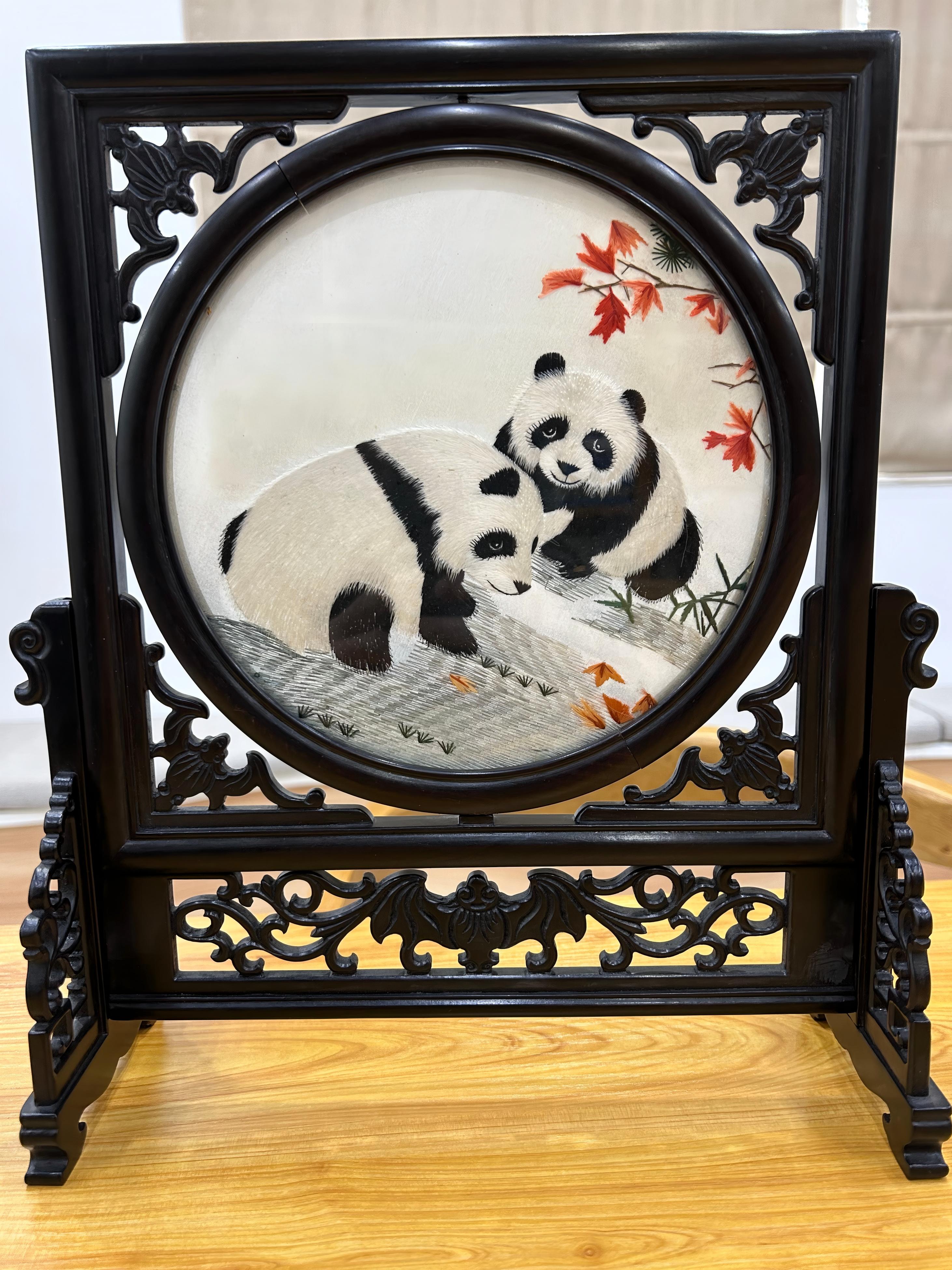 作品简介:双面蜀绣《熊猫出游》摆件,表现了熊猫的灵动与憨态可爱,用两根细如发丝的线,把熊猫的毛发绣得栩栩如生,其主要用铺针、运针、滚针、切针、飞毛针等针法绣制而成,使其图案浑然天成,找不到一点针线相接的针脚,主要制作材料为桑蚕丝制作染成的丝线和薄透的绢布。