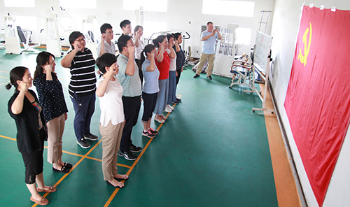 4个小时的帮扶工作结束后,第二党支部与南皮县康复中心支部联合举行了“不忘初心重温入党誓词”活动。面对鲜红的党旗,近2个月的细致准备和今天全员行动的各项成果历历在目:南皮县康复中心耳目一新的康复教学环境、康复教师获得技能的喜悦、听障儿童家长声声谢语、贫困残疾人感受关爱与鼓励……大家心潮澎湃,举起右手、握紧拳头,庄严宣誓!重温誓词,不忘共产党人为共产主义奋斗的初心,牢记全心全意为人民服务的使命,在新的征程上,为“全面建成小康社会,听力残疾人一个也不能少”而不懈努力。