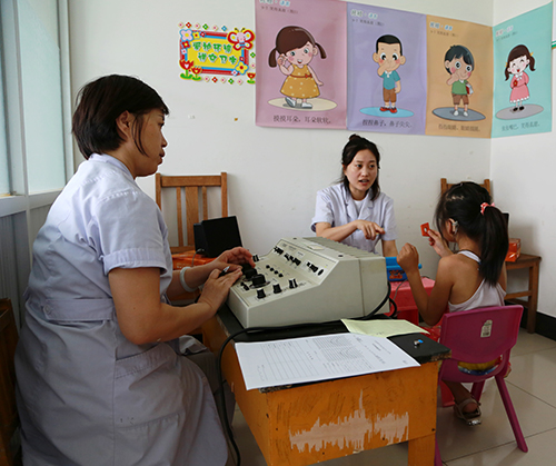 随行门诊部听力师自带设备,标定声场,紧张有序地为11名听障儿童进行听能评估、助听器调试和家长答疑服务,为在训儿童实施助听器优化。
